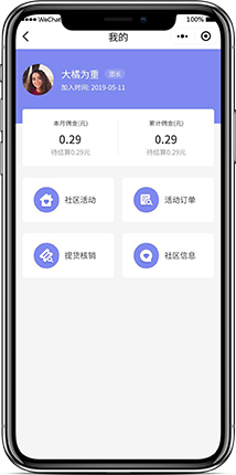 平台以社区为节点,全面打通线上线下,团长线上推广、线下交付的点对点卖货模式。