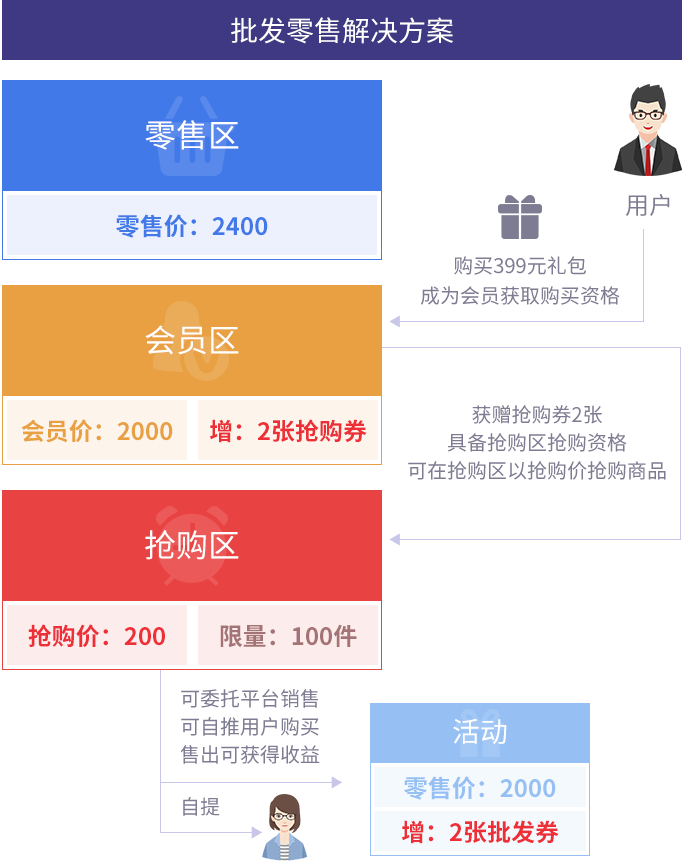 支持灵活调节活动专区、批发专区库存,便于把控推广进程。