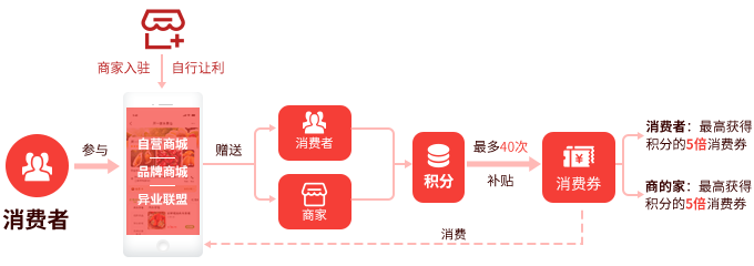 举例:商家A自行设置让利比例为20%,商家及其店内的消费者均可获得让利额等量的积分,同时还可获得积分数量5倍的消费券。
